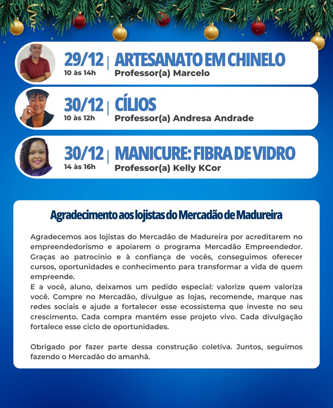 O Mercadão Empreendedor é um projeto social voltado para aqueles que desejam aprender novas habilidades, aprimorar seus conhecimentos e conquistar independência financeira. Com cursos gratuitos ministrados por especialistas, a iniciativa abre portas para quem deseja empreender, melhorar sua performance no mercado de trabalho ou iniciar um novo caminho profissional.